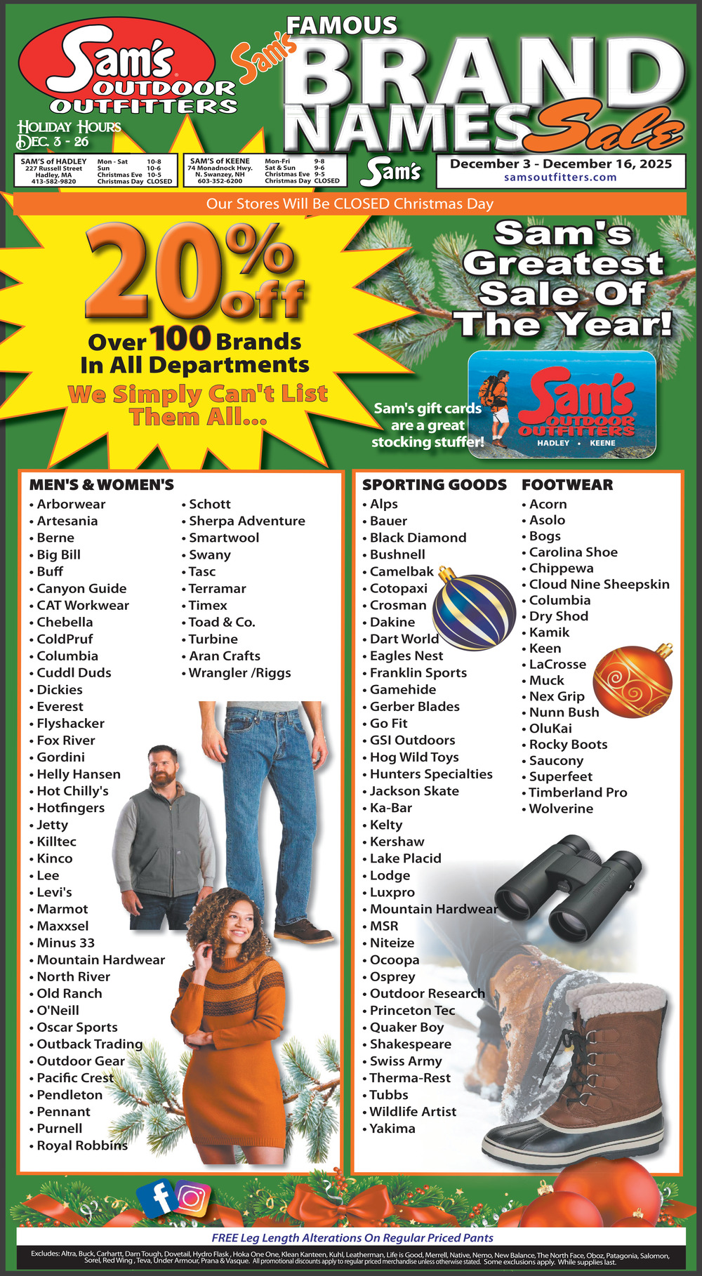 Dec 04, 2025. Sam's Outdoor Outfitters Clothing Ads from Monadnock Ledger-Transcript