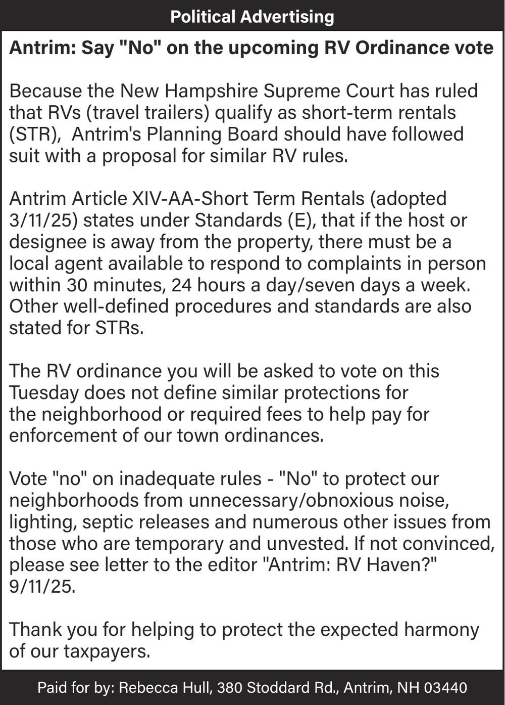 Antrim: Say "No" on the Upcoming RV Ordinance Vote
