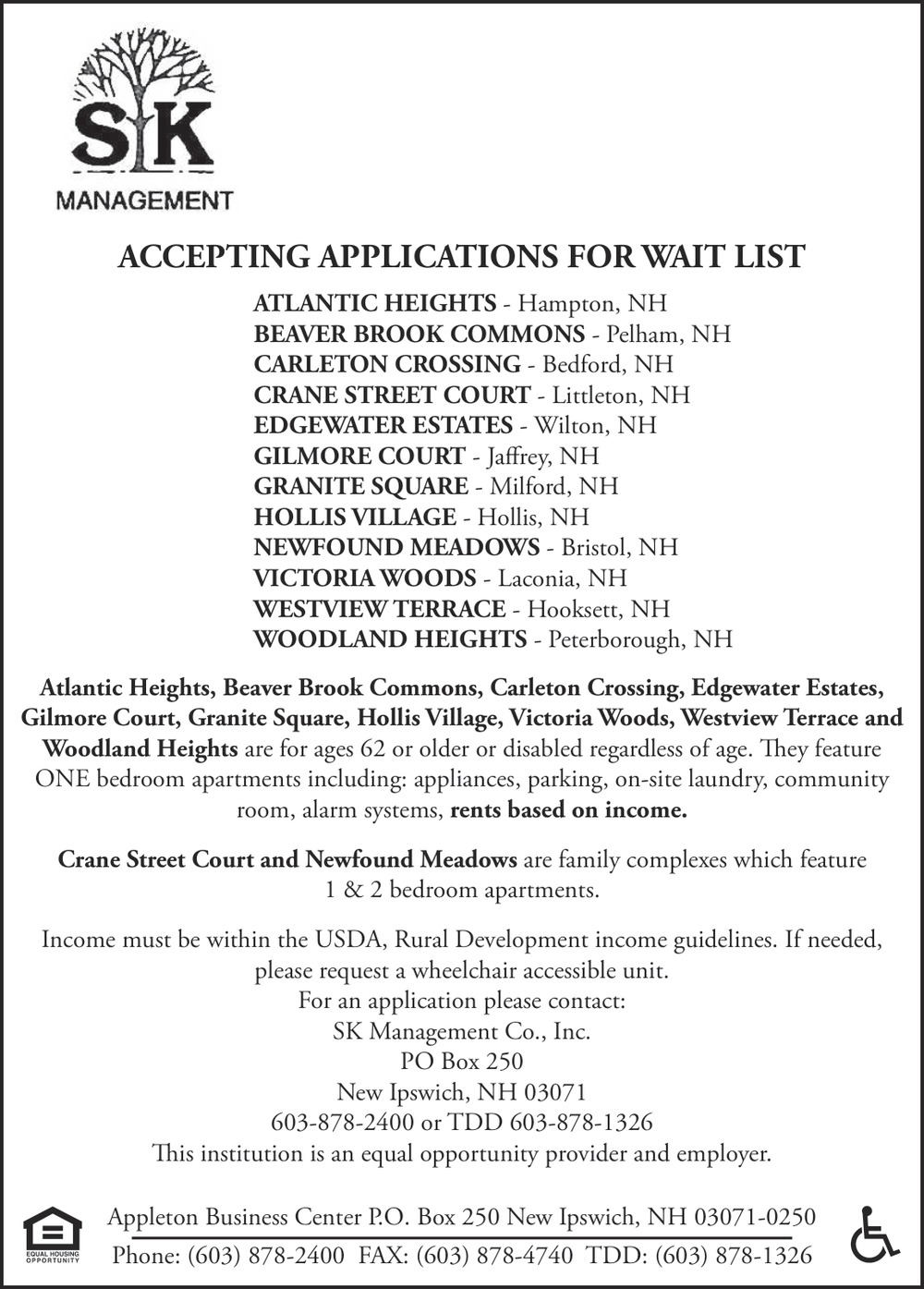 Apr 07, 2026. SK Management Co. Inc Senior Living Ads from Monadnock Ledger-Transcript