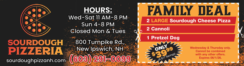Apr 21, 2026. Sourdough Pizzeria Restaurants Ads from Monadnock Ledger-Transcript
