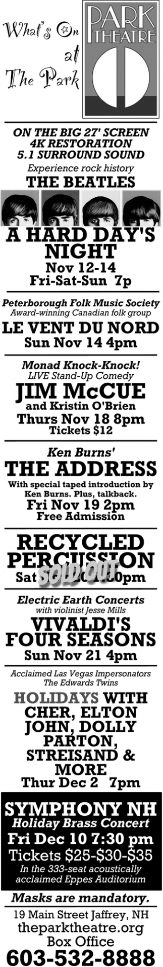 Nov 11, 2021. Park Theatre Shows & Theater Ads from Monadnock Ledger-Transcript
